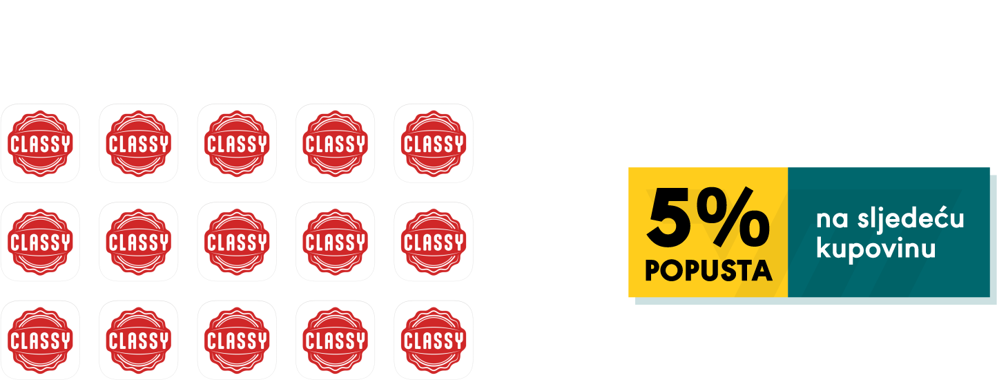 Za 1 CLASSY proizvod dobivate 1 naljepnicu. Naljepnice zalijepite na odgovarajuće mjesto na kuponu. Kada sakupite svih 15 naljepnica ostvarujete pravo na popust od 5% na sljedeću kupovinu. Kada sakupite svih 30 naljepnica ostvarujete pravo na popust od 10% na sljedeću kupovinu.